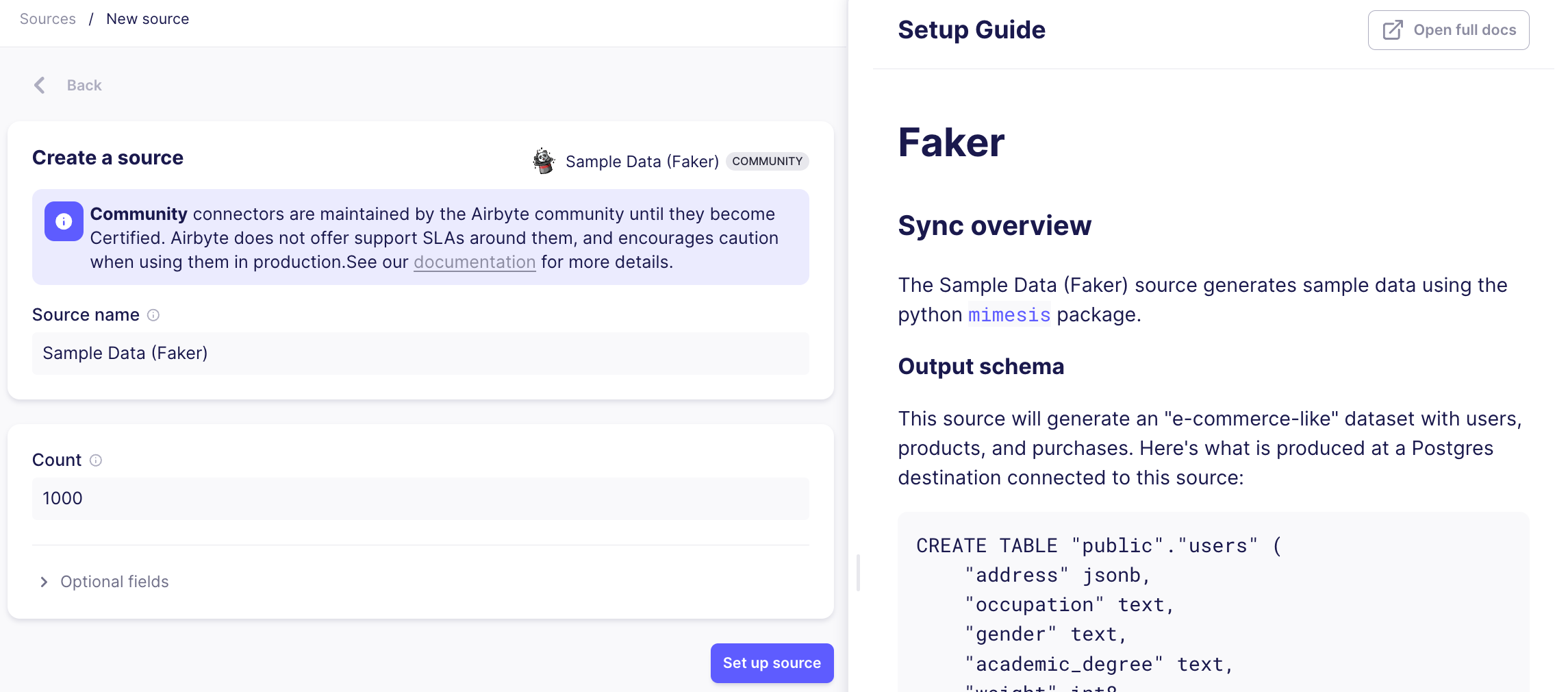 The left half of the page contains a set of fields that you will have to fill out. In the Source name field, you can enter a name of your choosing to help you identify this instance of the connector. By default, this will be set to the name of the source (ie, Sample Data (Faker)).